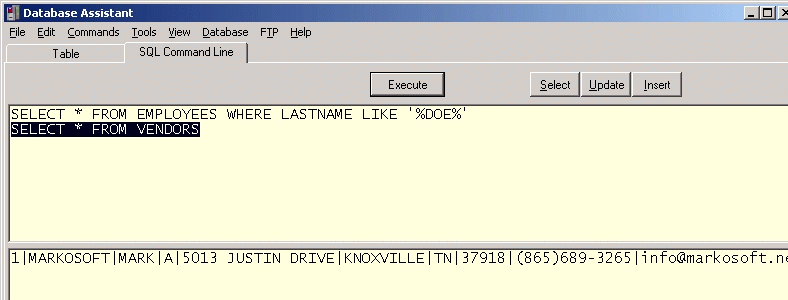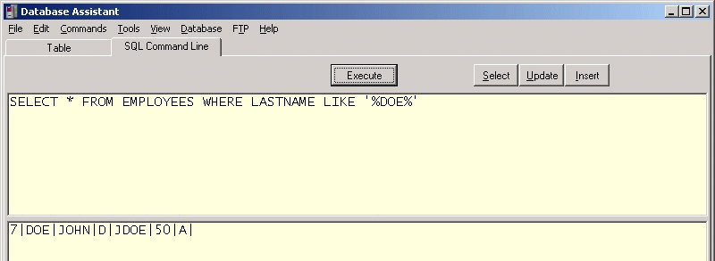 If there are pipe delimited records in the results pane of the SQL Command Line screen or if there is a file that has been saved as pipe delimited records, these records can be inserted into a table using the Insert Records Using ASCII menu option as long as the database schema matches that of the records and  there are no index violations.