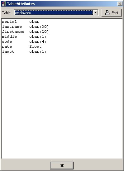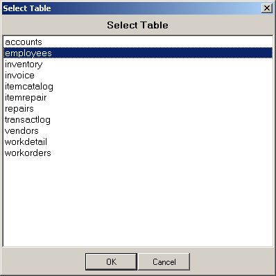 After the main screen opens, click the Select Table button located on the menu bar or choose the Select Table menu option from the Commands menu. Once the dialog screen opens, choose the table you want to query or edit and click the OK button.