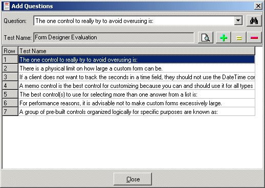 To add questions to a test,  select Add Questions from the Test drop down menu.  After selecting a test to add questions to via the Add Questions to Test dialog, use the question combobox to select a question and use the Add, Update, and Remove buttons to edit the questions on a test.  Use the Find button to perform keyword searches in order to find specific questions.