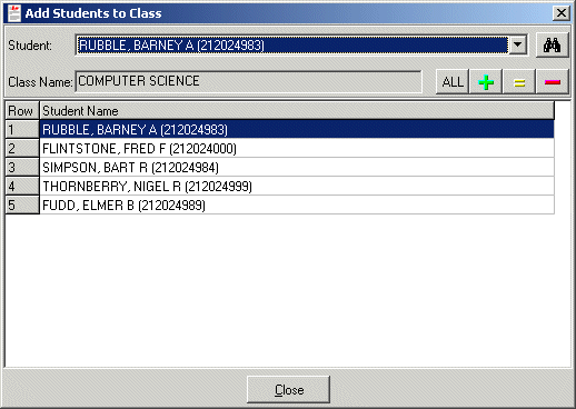 To add students to a class,  select Add Students from the Classes drop down menu.  After selecting a class to add students to via the Select Class dialog, use the student combobox to select a student and use the Add, Update, and Remove buttons to edit the students in a class.  Use the Find button to perform keyword searches in order to find specific students.