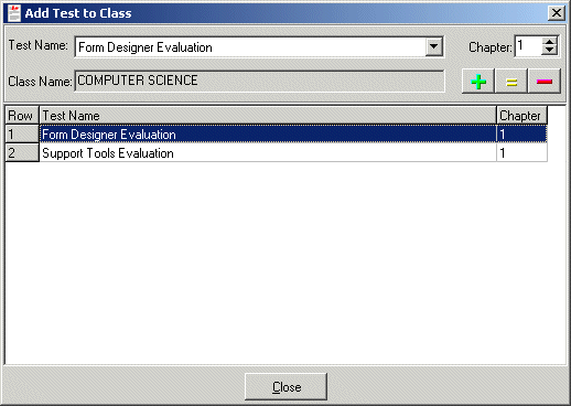 To add tests to a class,  select Add Test from the Classes drop down menu.  After selecting a class to add students to via the Select Class dialog, use the test name combobox to select a test and use the Add, Update, and Remove buttons to edit the tests in a class.