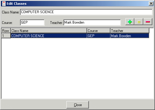 To create a new class or to edit a class, select Edit from the Classes menu.  Use the edit boxes at the top of the screen to edit the class information and use the Add, Update, and Remove buttons to execute any changes to a class description.
