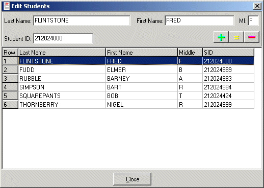 To create a new student or to edit a student, select Edit from the Students menu.  Use the edit boxes at the top of the screen to edit the student information and use the Add, Update, and Remove buttons to execute any changes to a student description.